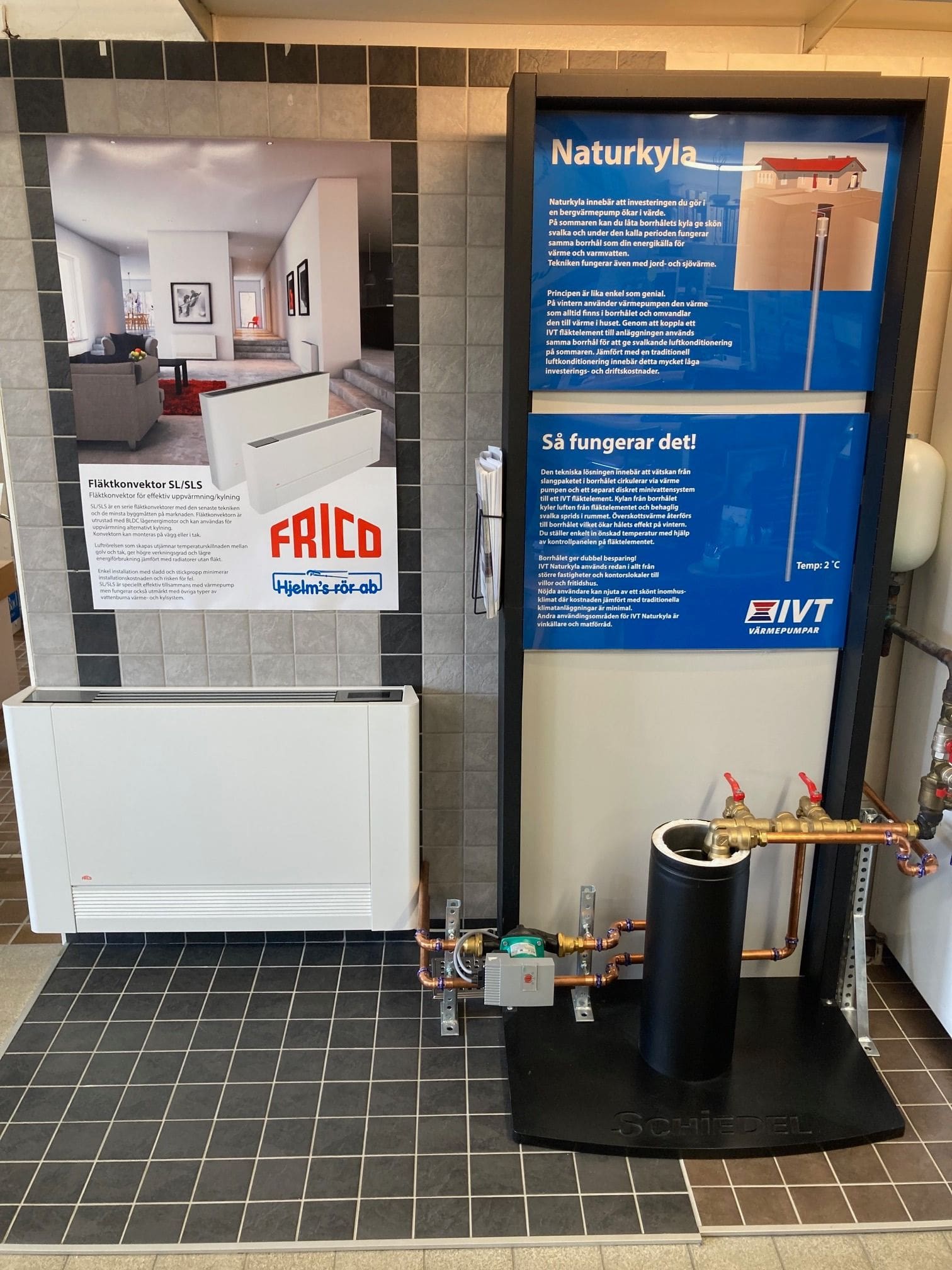Den tekniska lösningen innebär att vätskan från slangpaketet i borrhålet cirkulerar genom värmepumpen och ett separat minivattensystem till ett IVT fläktelement. Kylan från borrhålet kyler luften från fläktelementet och sprider behaglig svalka i rummet.